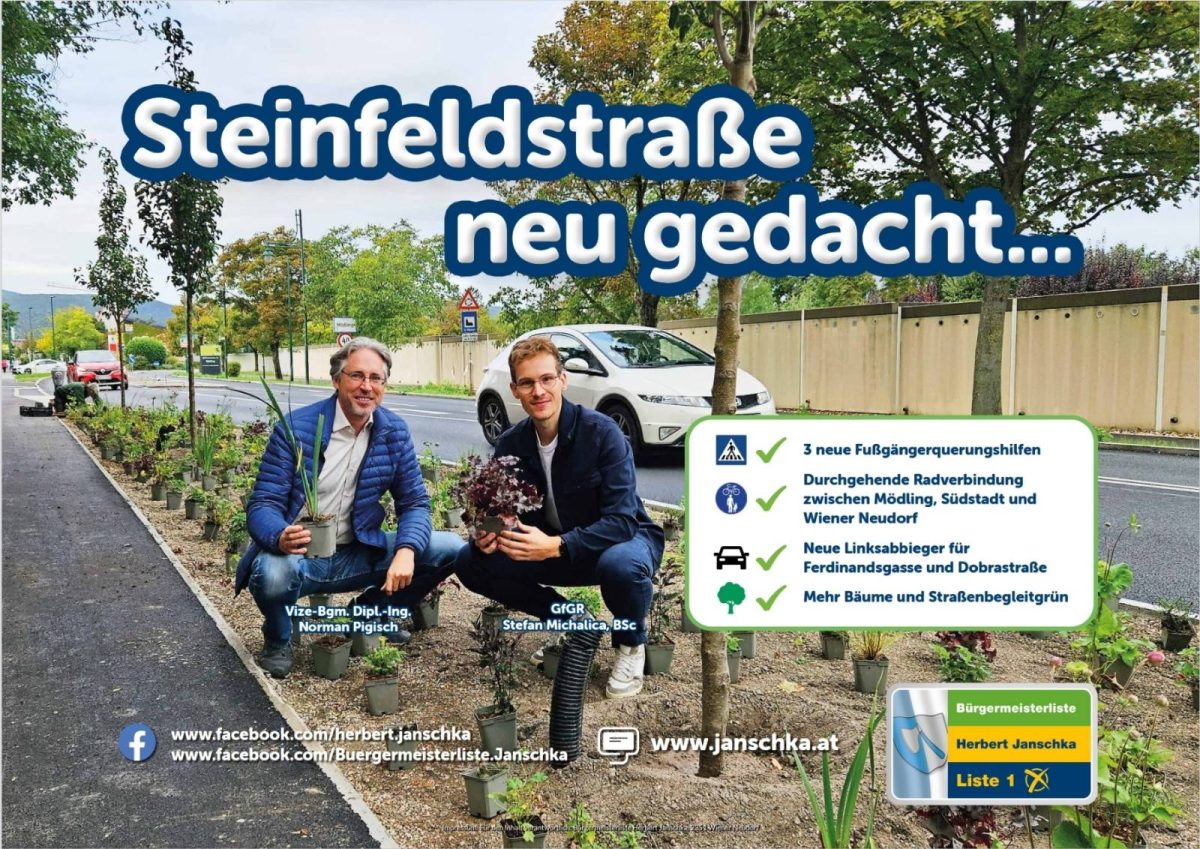 Ich freue mich sehr, dass wir einen Punkt unseres Wahlprogrammes für die Periode 2025 – 2030 sehr rasch verwirklichen konnten: Die Neugestaltung der Steinfeldstraße. Die Idee dazu entstammt der Feder unseres Vize-Bürgermeisters DI Norman Pigisch, der im Hauptberuf Verkehrsplaner ist.