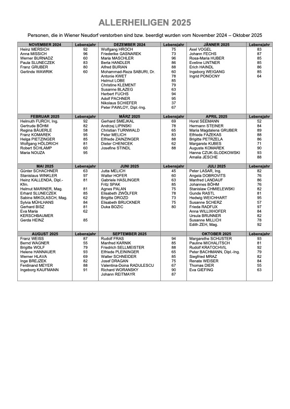 Immer am 1. November gedenken wir in Wiener Neudorf der Verstorbenen des letzten Jahres – in Form einer Feier am Friedhof, die um 9:15 Uhr beginnt und einer nachfolgenden Prozession über das Klosterareal (Schwesternfriedhof) zu unserer Pfarrkirche, wo wir als Abschluss um ca. 10:30 Uhr ein Hochamt feiern. So wird es auch am kommenden Samstag sein.