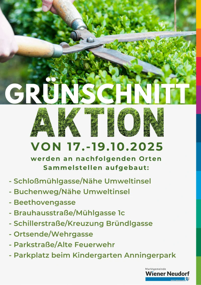 Heute werden von unserem Wirtschaftshof wieder in den acht bewährten Ortsteilen Sammelstellen geschaffen, an denen Wiener Neudorfer Haushalte von Freitag bis Sonntag Grünschnitte abgeben können.