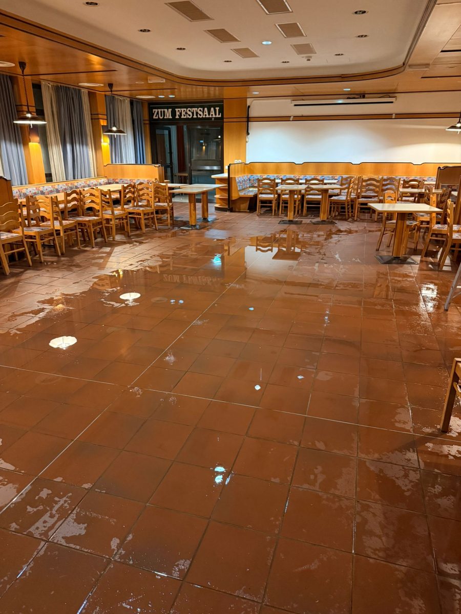 Wir hatten am Wochenende einen Wasserschaden im – oder genauer geschrieben – oberhalb des Restaurants„Ab & Zu“. Da die Decke komplett unter Wasser stand, drang dieses über diverse Auslässe in die Innenräumlichkeiten. Damit das Wasser ablaufen kann, wurden umgehend Löcher in die Decke gebohrt.