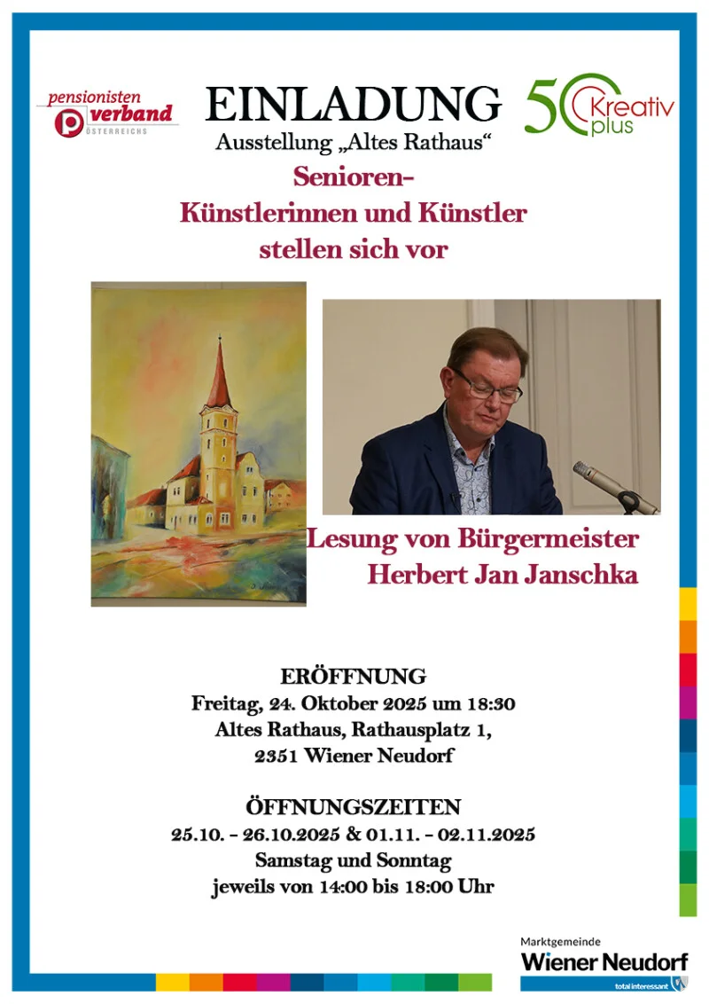 Der 15. Geburtstag dieses Vereins wird am Freitag, den 24. Oktober um 18:30 Uhr im Alten Rathaus von Wiener Neudorf, Rathausplatz 1 (gleich neben der B17) im Rahmen eines Festaktes gefeiert. Bei einer Vernissage stellen sich wieder „Senioren-Künstler/-innen“ vor und werden ihre Werke präsentieren, die dann auch an den folgenden zwei Sams- und Sonntagen (siehe oben) zu bewundern sein werden.