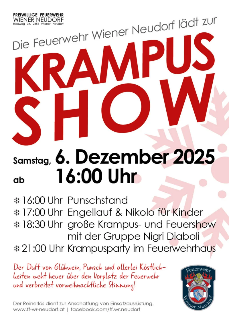 Damit es einen gewissen Ausgleich gibt, findet in Wiener Neudorf die traditionelle Krampus-Show dafür am Nikolaustag statt. So ist bei uns wieder alles im Gleichgewicht – kalendermäßig betrachtet.