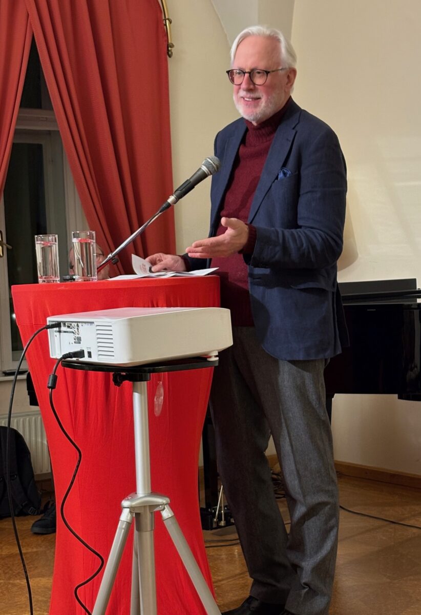 Höhepunkt des Abends war für mich der Vortrag des renommierten Kunsthistorikers Carl Aigner. Unter dem Titel „Die Kunst der Technik – Kein Kunstwerk ohne Werktechnik“ beleuchtete er das Zusammenspiel von Kunst und technischer Innovation – von Fotografie und Video bis hin zur heutigen künstlichen Intelligenz, die unsere Wahrnehmung erneut tiefgreifend verändert.